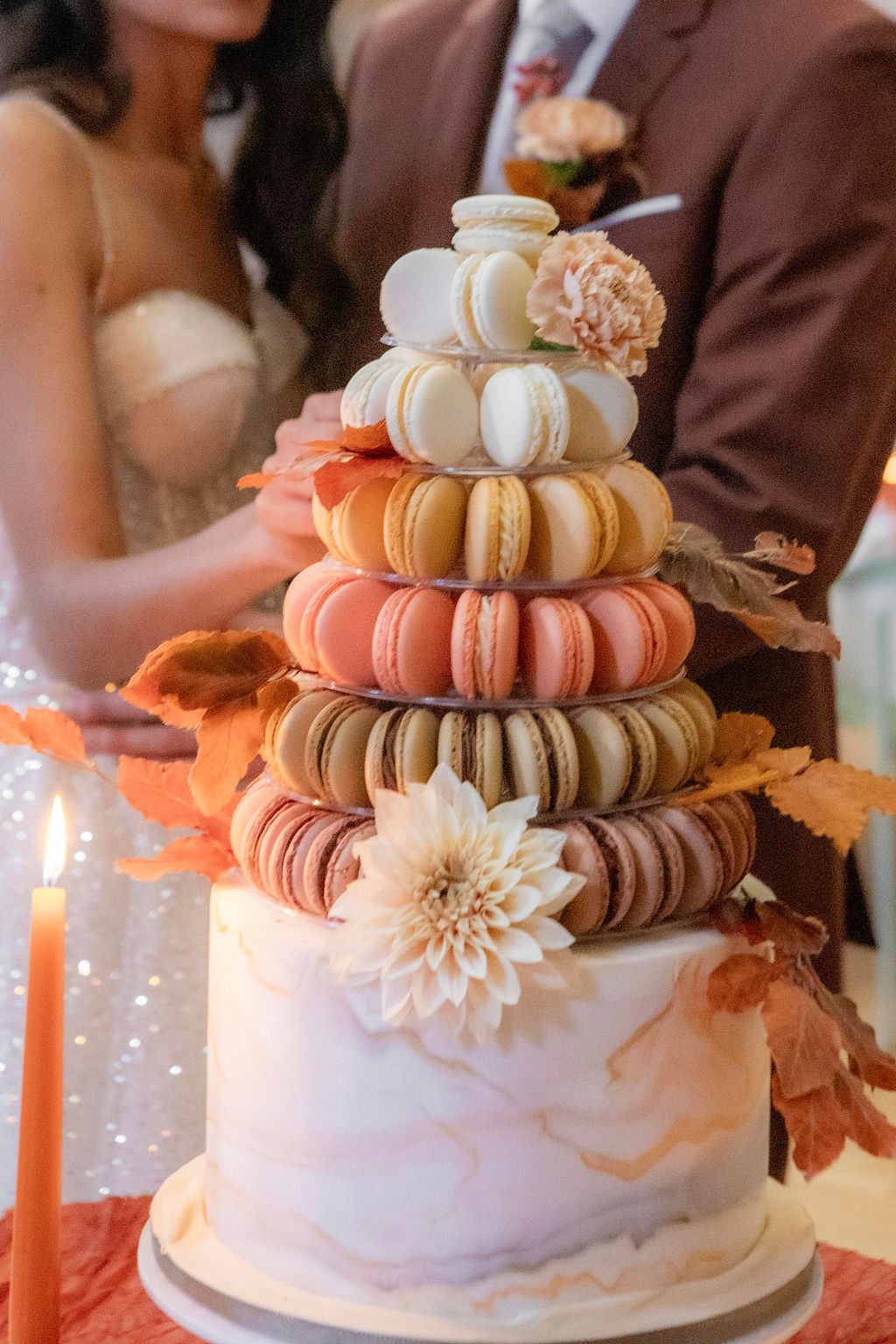 Amacaron tower and cakein warm tones delighted the couple as they awaited their guests.