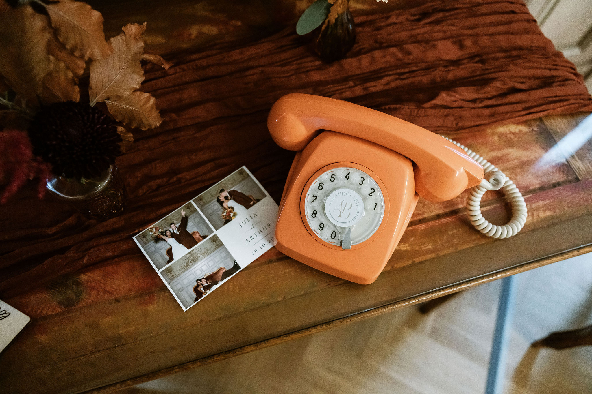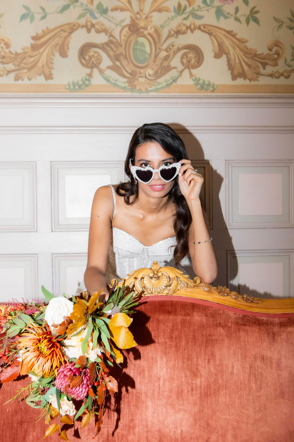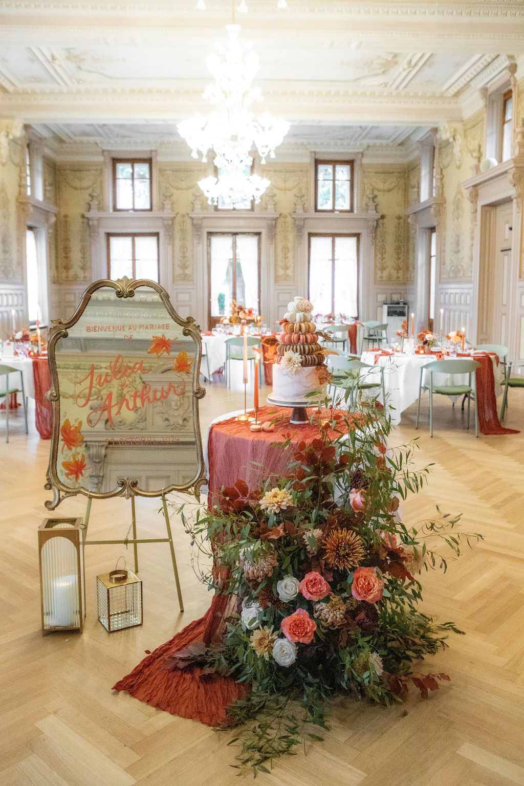 Thewelcome sign, painted by hand on a vintage mirror, was adorned withautumn colors and delicate gold leaf details, greeting guests upon arrival in thehistoric reception hall dating back to 1860.