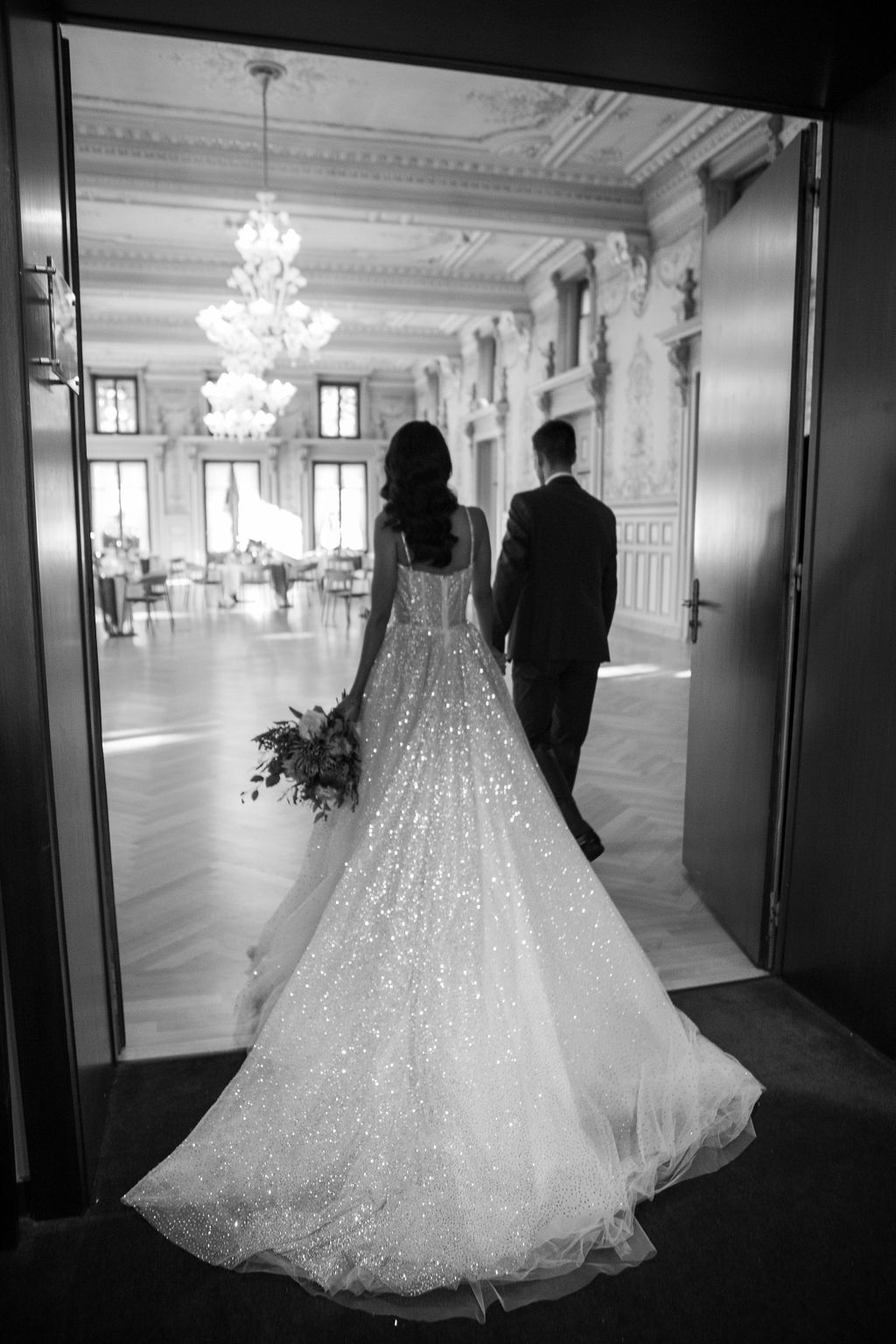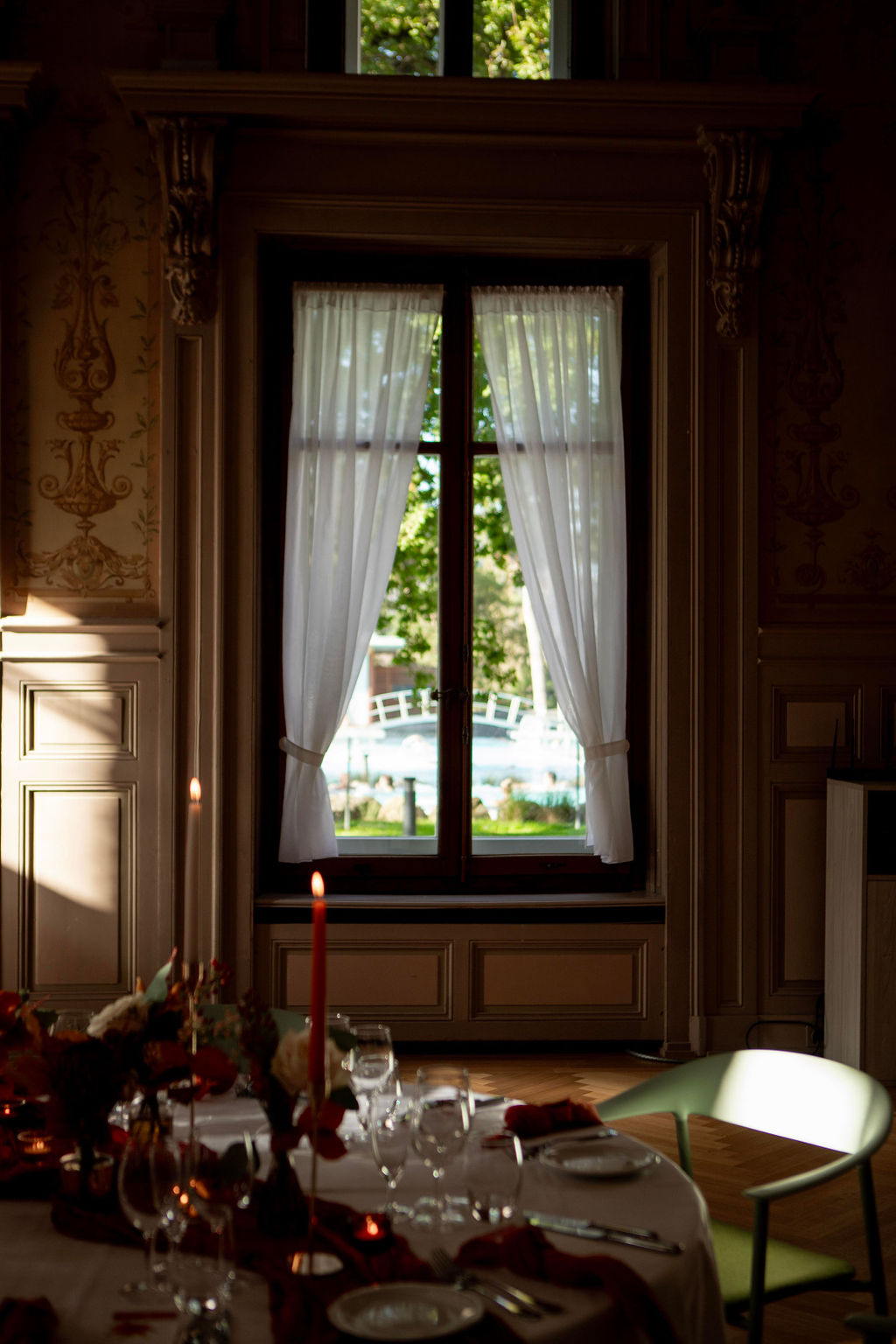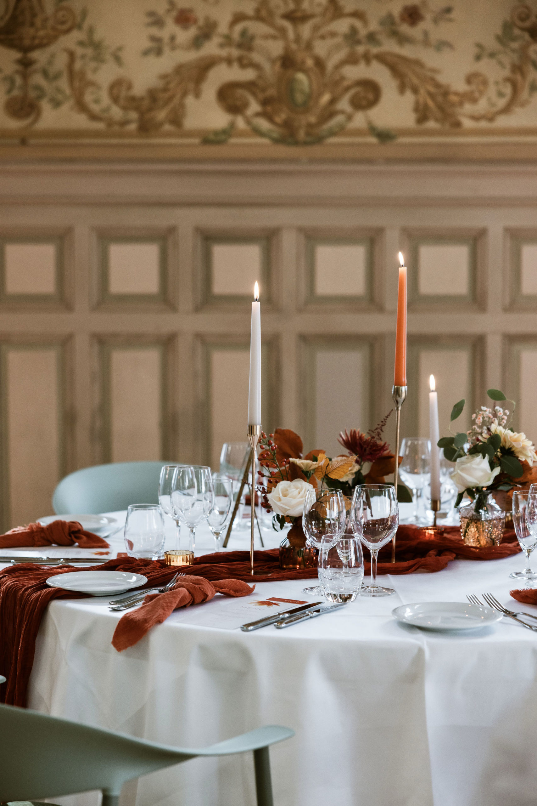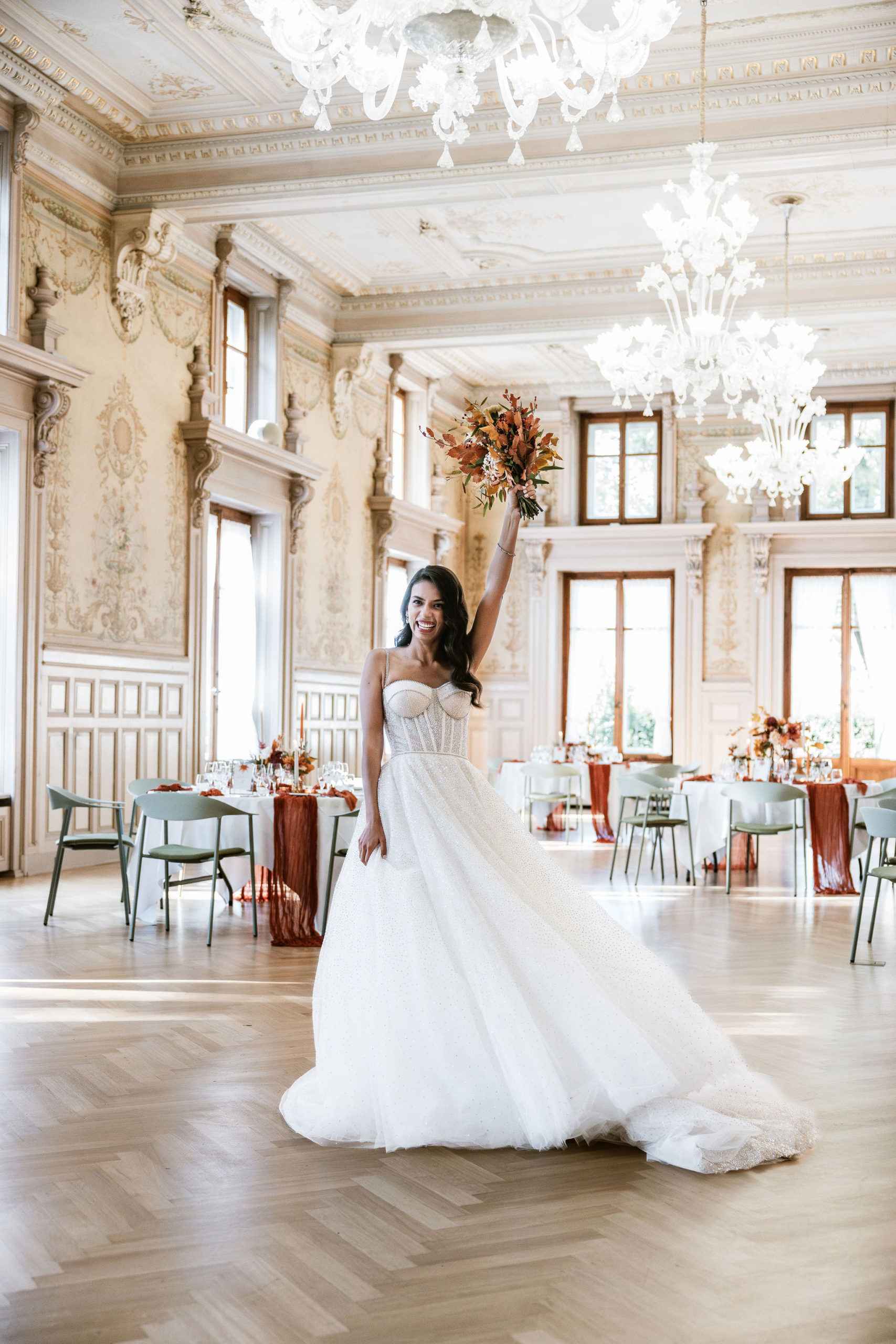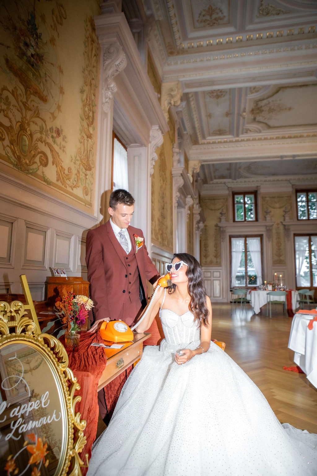 After the ceremony, the couple and their guests gathered in thegrand reception hallof Les Bains de Lavey, beautifully decorated in shades ofterracotta, gold, and copper brown. Chandeliers and candles cast a soft glow, creating an atmosphere that was bothelegant and inviting.