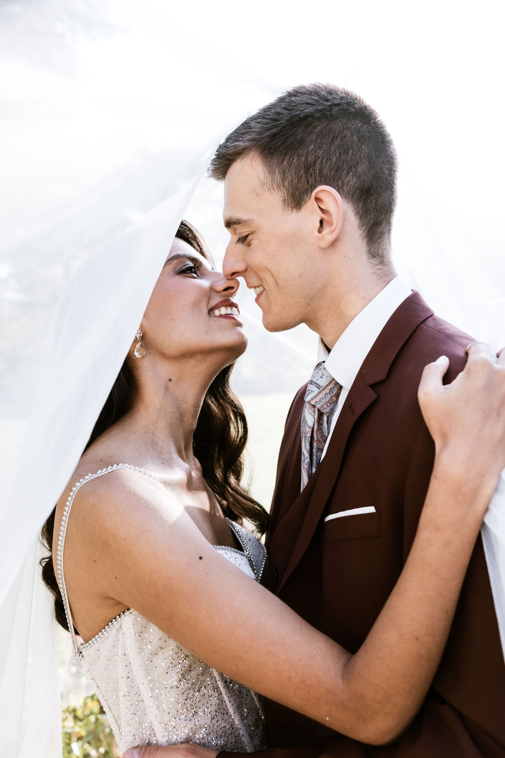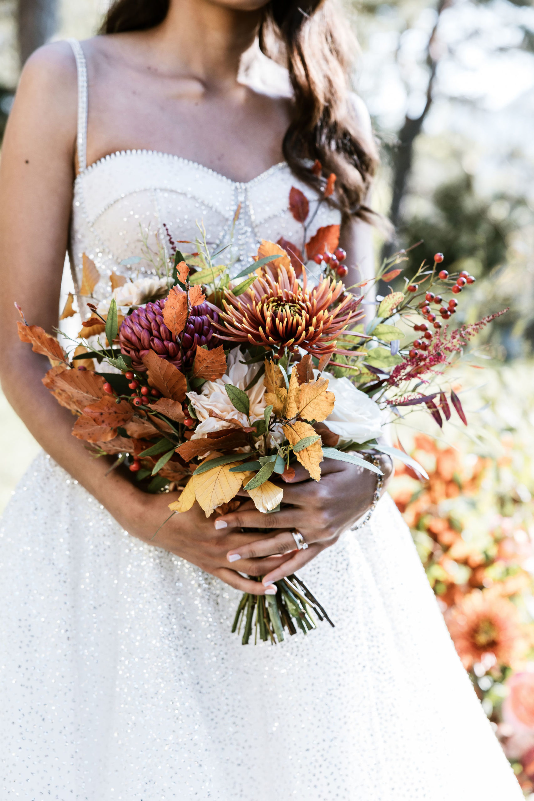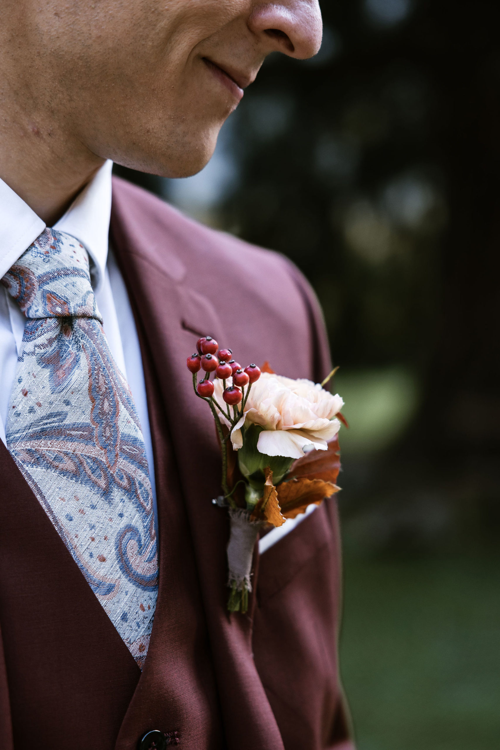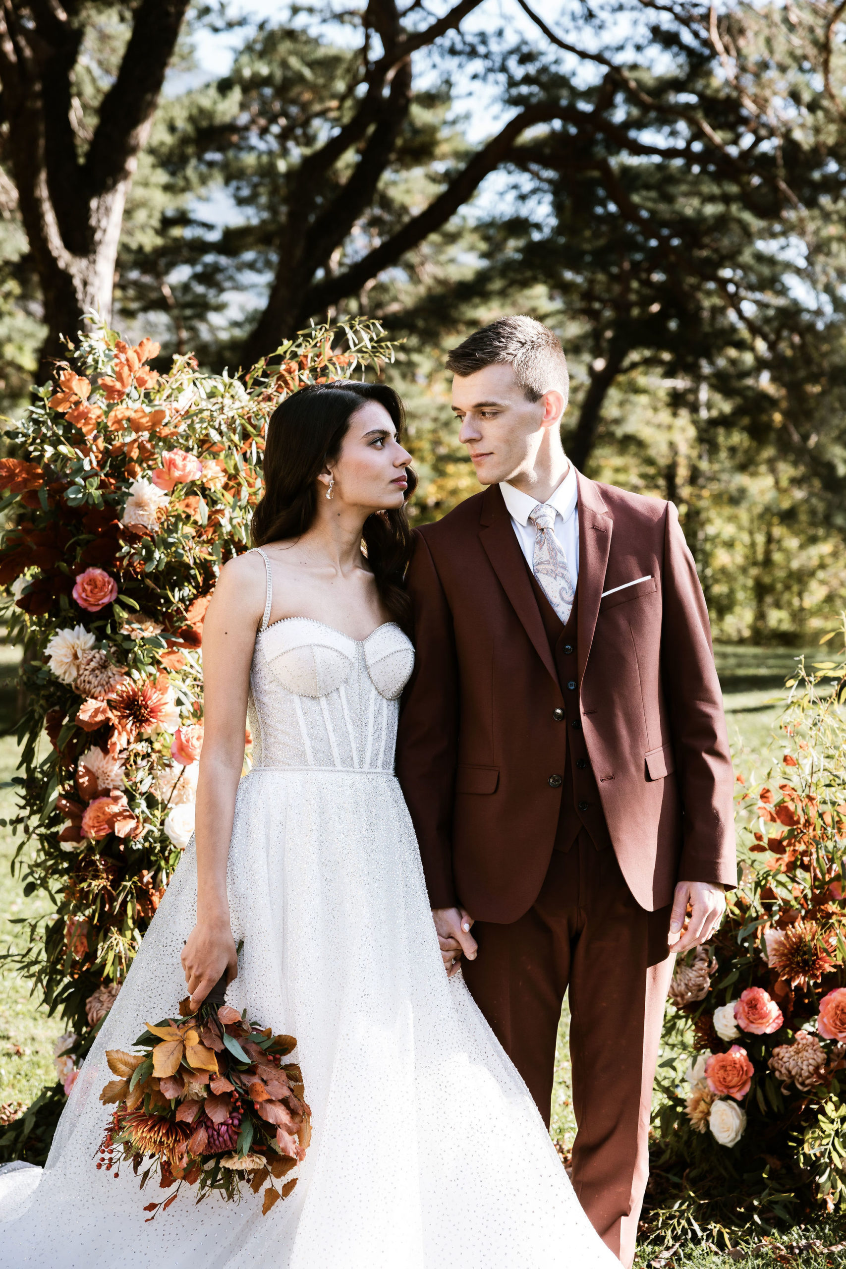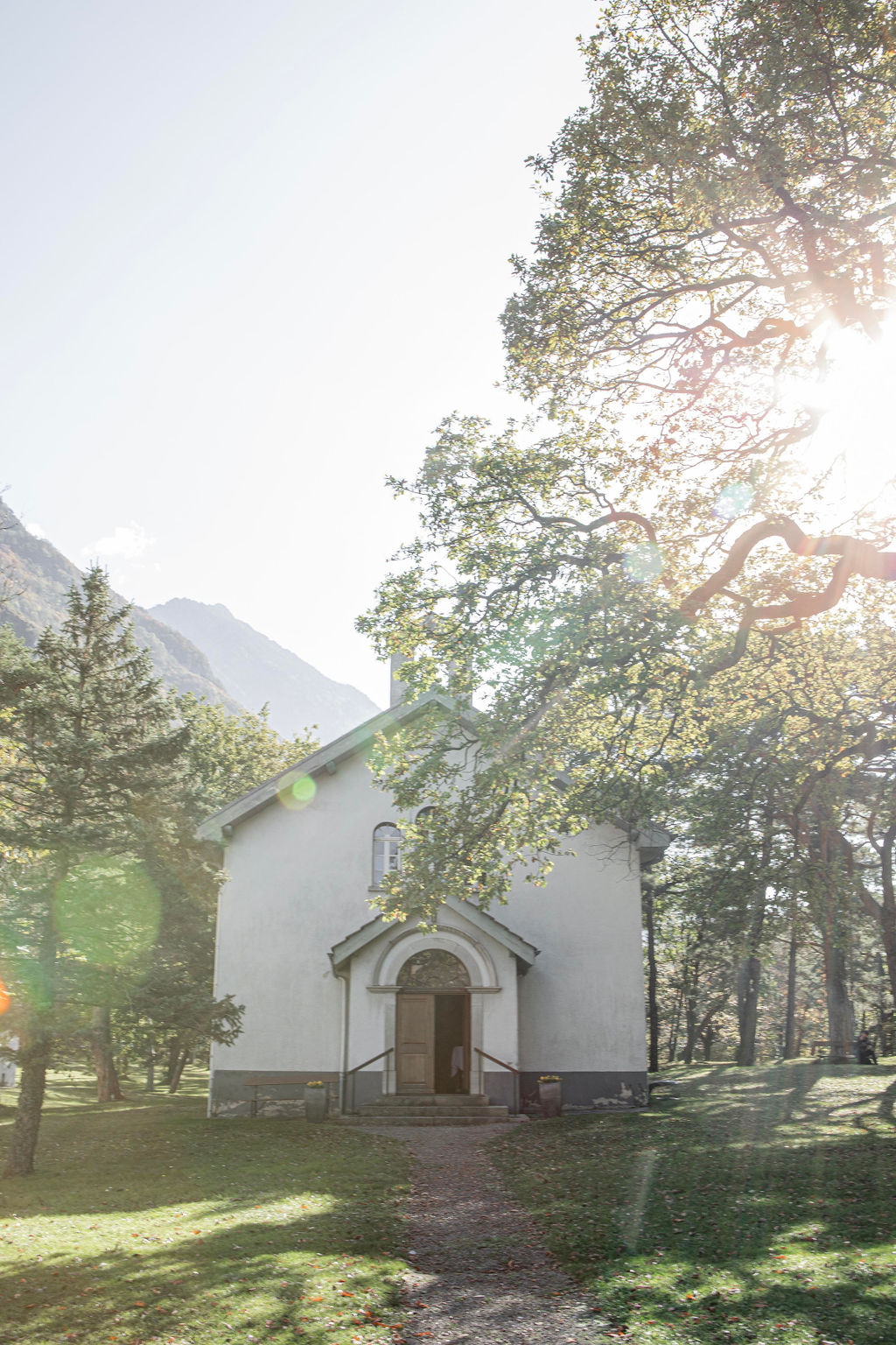 Under the trees painted in a thousand copper shades, the ceremony took place outdoors, in thebeautiful gardens of Les Bains de Lavey. Near a small chapel, aflower archadorned with golden foliage and dried blooms welcomed the couple for a “yes” bathed in autumn light.